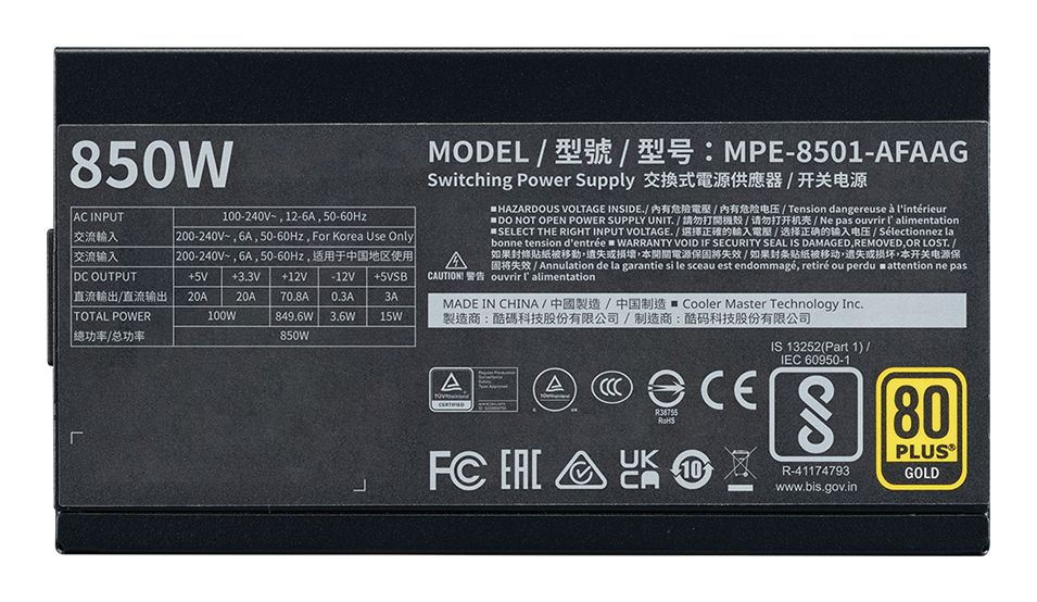 Cooler Master MWE Gold 850 V2 ATX 3.1. Potenza totale: 850 W, Tensione di ingresso AC: 100 - 240 V, Frequenza di ingresso AC: 50/60 Hz. Connettore scheda madre: 24-pin ATX, Lunghezza del cavo di alimentazione della scheda madre: 61 cm, Lunghezza del cavo di alimentazione SATA: 500,620,740,860 mm. Utilizzo: PC, Fattore di forma dell'unità di alimentazione (PSU): ATX, Certificazione 80 PLUS: 80 PLUS Gold. Colore del prodotto: Nero, Tipo di raffreddamento: Attivo, Diametro del ventilatore: 12 cm. Certificazione: TUV, CE, CCC, EAC, RCM, cTUVus, FCC, BSMI, BIS, UKCA