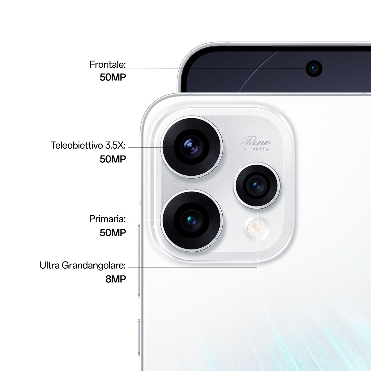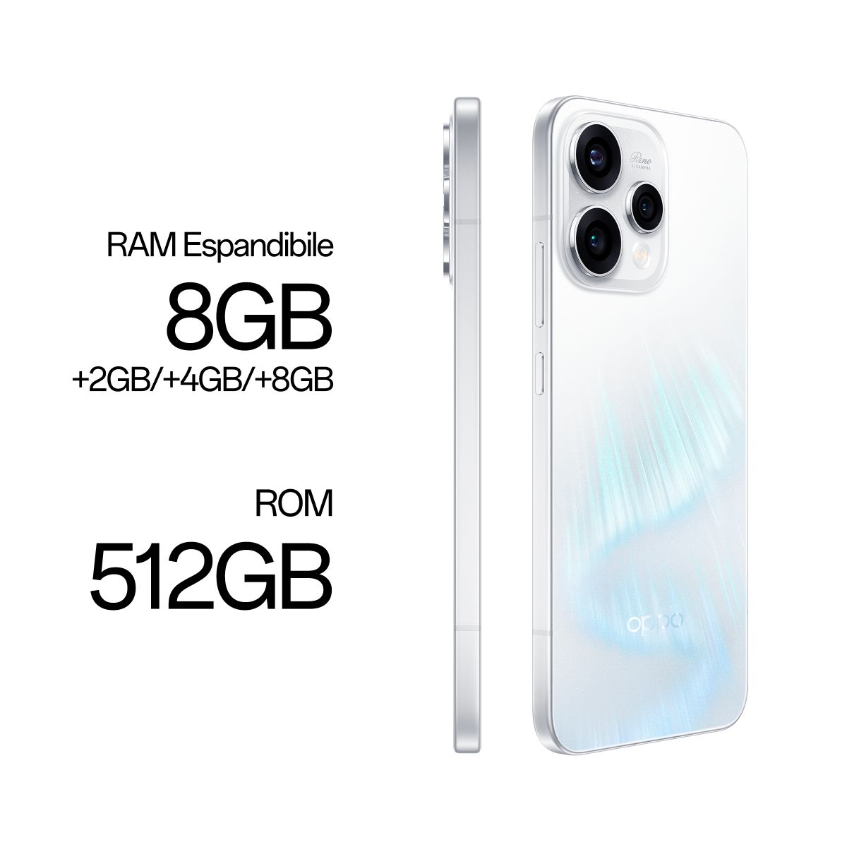 OPPO Reno15 5G AI Smartphone, Tripla fotocamera 50+50+8MP, Selfie 50MP, Display 6.59” 120HZ AMOLED FHD+, 6500mAh, RAM 8GB(Esp2GB/4GB/8GB)+ROM 512GB [Versione Italia], Aurora White. Dimensioni diagonale schermo: 16,7 cm (6.59"), Risoluzione del display: 2760 x 1256 Pixel. Famiglia processore: Snapdragon, Modello del processore: 7 Gen 4. Capacità della RAM: 8 GB, Tipo di RAM: LPDDR5X, Capacità memoria interna: 512 GB. Risoluzione fotocamera posteriore (numerico): 50 MP, Tipo di fotocamera posteriore: Tripla fotocamera. Capacità della scheda SIM: Doppia SIM. Sistema operativo incluso: Android 16.0. Capacità della batteria: 6500 mAh. Colore del prodotto: Bianco. Peso: 197 g
