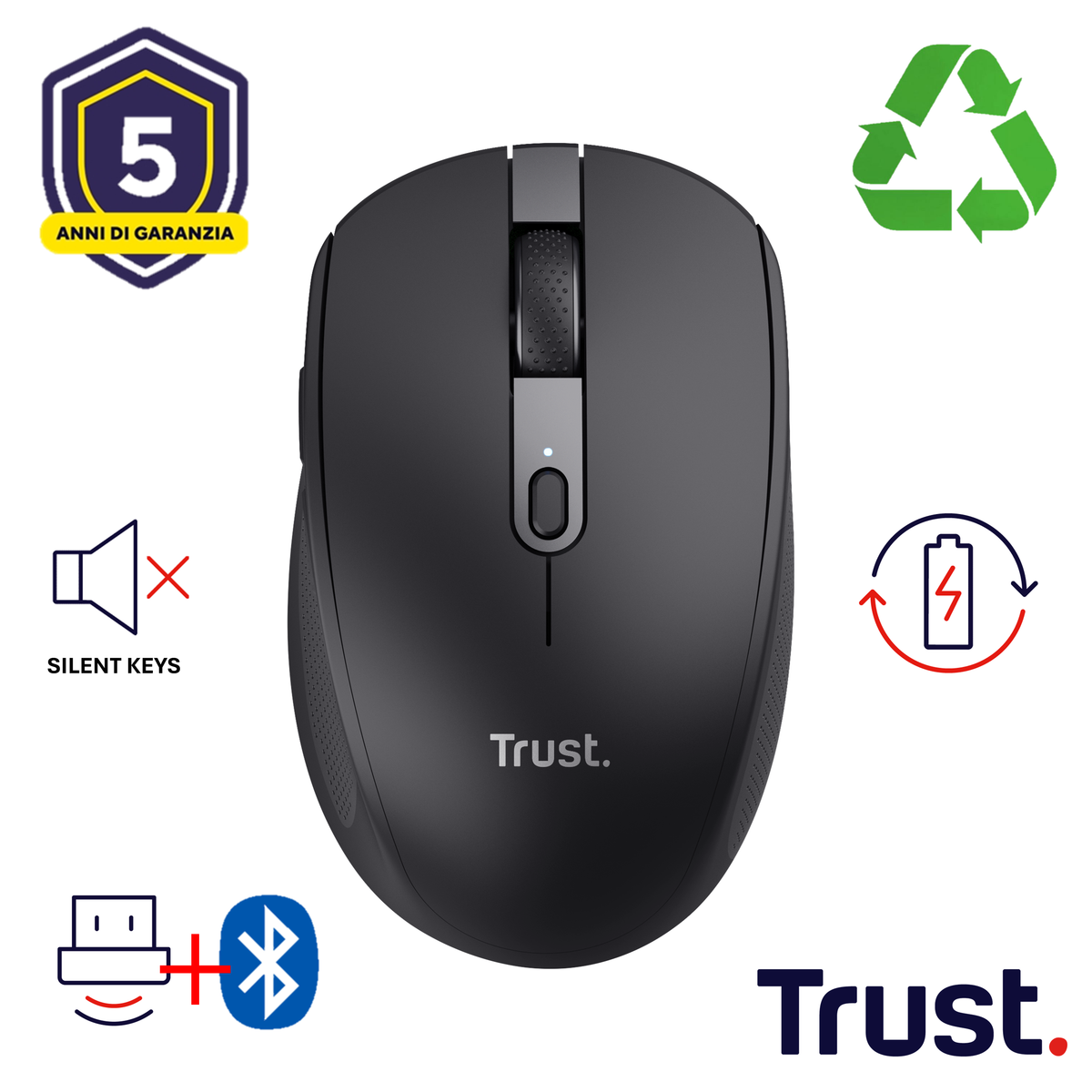 Trust Ozaa. Fattore di forma: Mano destra. Tecnologia di rilevamento del movimento: Ottico, Interfaccia dispositivo: RF senza fili + Bluetooth, Risoluzione movimento: 3200 DPI, Tipo di pulsanti: Tasti premuti, Numero di tasti: 6, Tipo di scorimmento: Rotella. Alimentazione: Batterie. Colore del prodotto: Nero