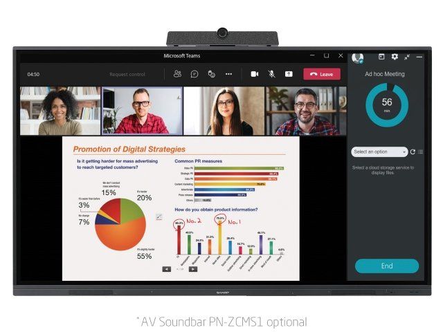 Sharp PN-L862B. Dimensioni schermo: 2,18 m (86"), Luminosità schermo: 350 cd/m², Risoluzione del display: 3840 x 2160 Pixel. Sistema operativo incluso: Android 9, Architettura processore: ARM Cortex-A73, Memoria utente: 32 GB. Potenza altoparlante: 20 W. Wi-Fi standard: Wi-Fi 5 (802.11ac), Standard Wi-Fi: 802.11a, 802.11b, 802.11g, Wi-Fi 4 (802.11n), Wi-Fi 5 (802.11ac), Velocità trasferimento Ethernet LAN: 10,100 Mbit/s. Connessione cuffia: 3,5 mm