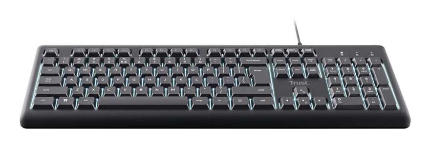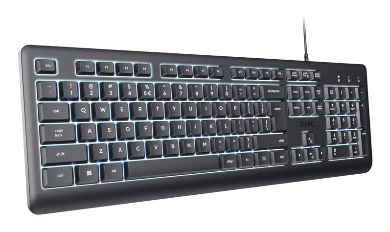 Trust Primo Beleuchtete. Fattore di forma tastiera: Full-size (100%). Stile tastiera: Dritto. Tecnologia di connessione: Cablato, Interfaccia dispositivo: USB, Struttura tastiera: QWERTY, Numero pulsanti tastiera: 104. Lunghezza cavo: 1,8 m. Utilizzo raccomandato: Casa/ufficio. Colore del prodotto: Nero