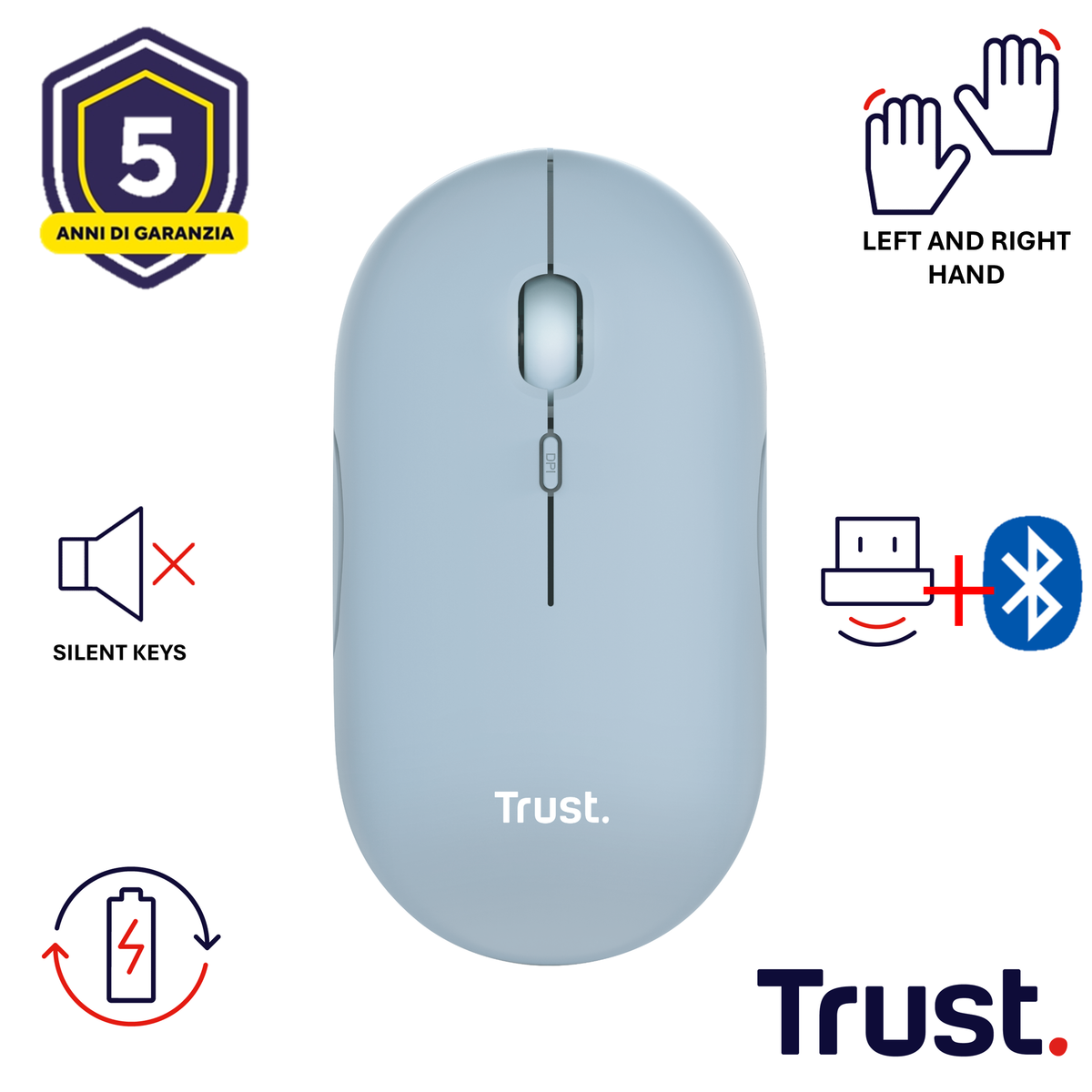 Trust Puck. Fattore di forma: Ambidestro. Interfaccia dispositivo: RF senza fili + Bluetooth, Risoluzione movimento: 1600 DPI, Tipo di pulsanti: Tasti premuti, Numero di tasti: 4, Tipo di scorimmento: Rotella. Alimentazione: Batterie. Colore del prodotto: Blu