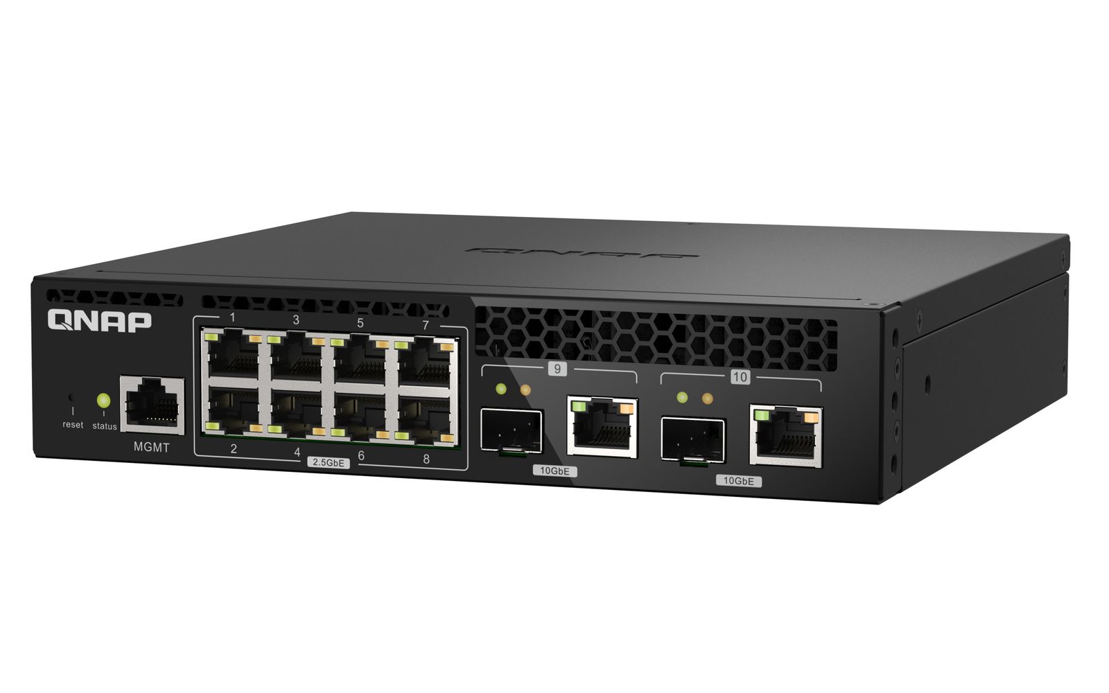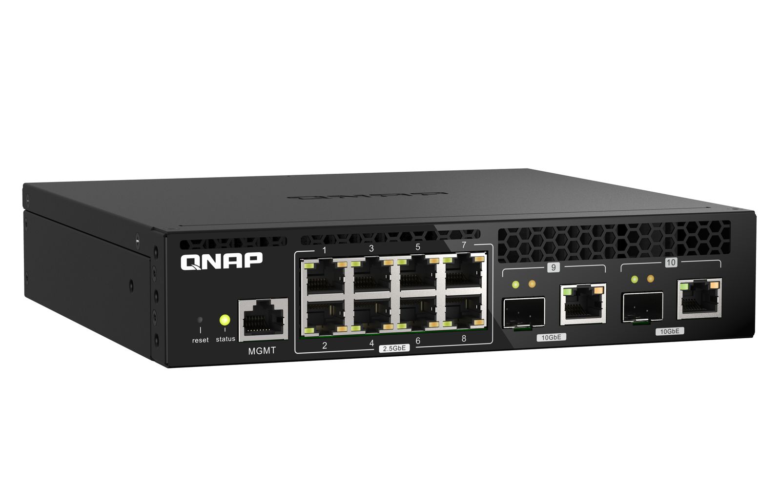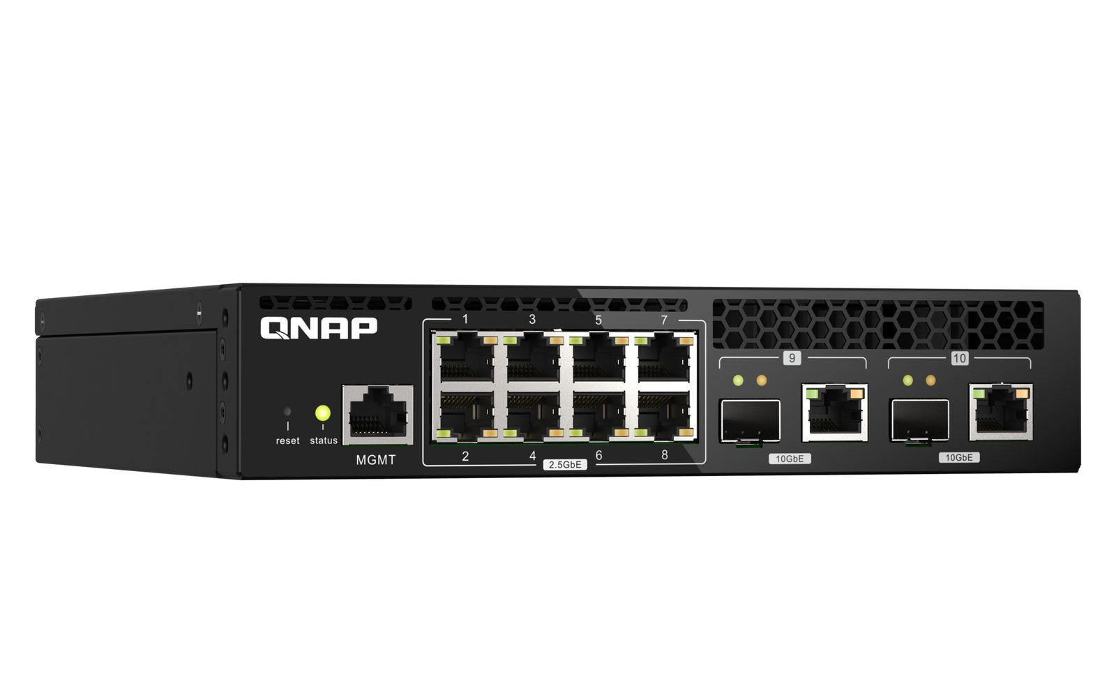 QNAP QSW-M2108R-2C. Tipo interruttore: Gestito, Livello del commutatore: L2. Tipo di porte RJ-45: 2.5G Ethernet (100/1000/2500), Quantità di porte RJ-45: 8, Console port: RJ-45. Full duplex. Dimensioni tavola MAC: 16000 voci, Capacità di commutazione: 80 Gbit/s. Standard di rete: IEEE 802.1Q, IEEE 802.1w, IEEE 802.3, IEEE 802.3ab, IEEE 802.3ae, IEEE 802.3an, IEEE 802.3az, IEEE.... Supporto Power over Ethernet (PoE). Montaggio rack