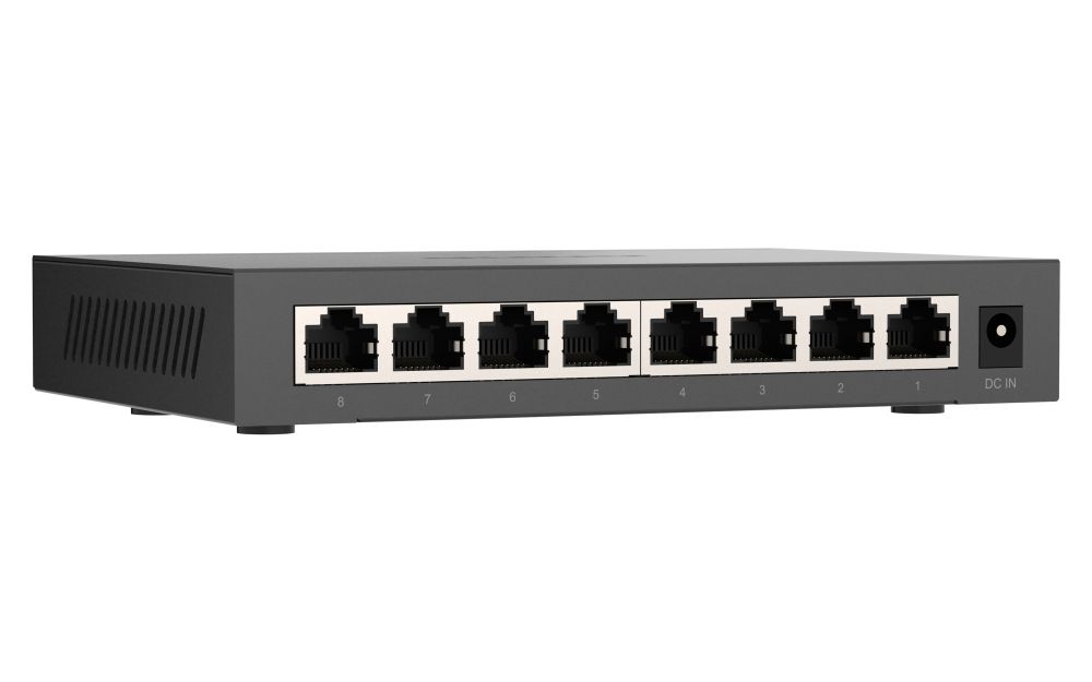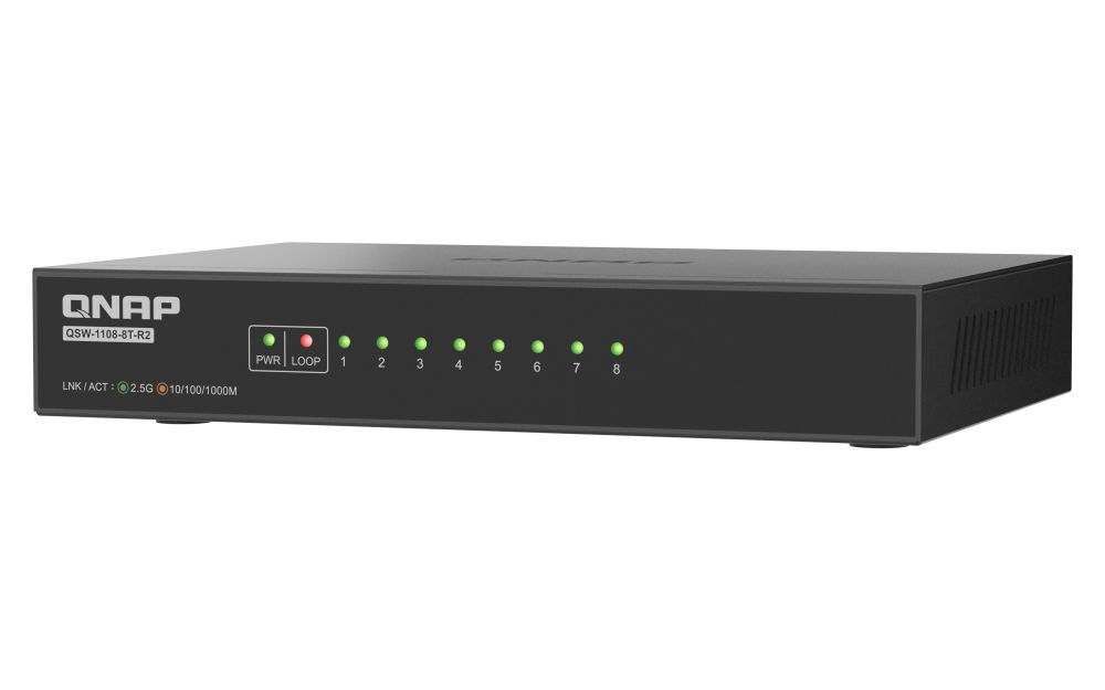 QNAP QSW-1108-8T-R2. Tipo interruttore: Non gestito. Tipo di porte RJ-45: 2.5G Ethernet (100/1000/2500), Quantità di porte RJ-45: 8. Dimensioni tavola MAC: 4000 voci, Capacità di commutazione: 40 Gbit/s. Standard di rete: IEEE 802.3, IEEE 802.3ab, IEEE 802.3az, IEEE 802.3bz, IEEE 802.3u, IEEE 802.3x. Voltaggio input DC: 12 V. Connettore di alimentazione: Jack DC-ingresso. Fattore di forma: Desktop