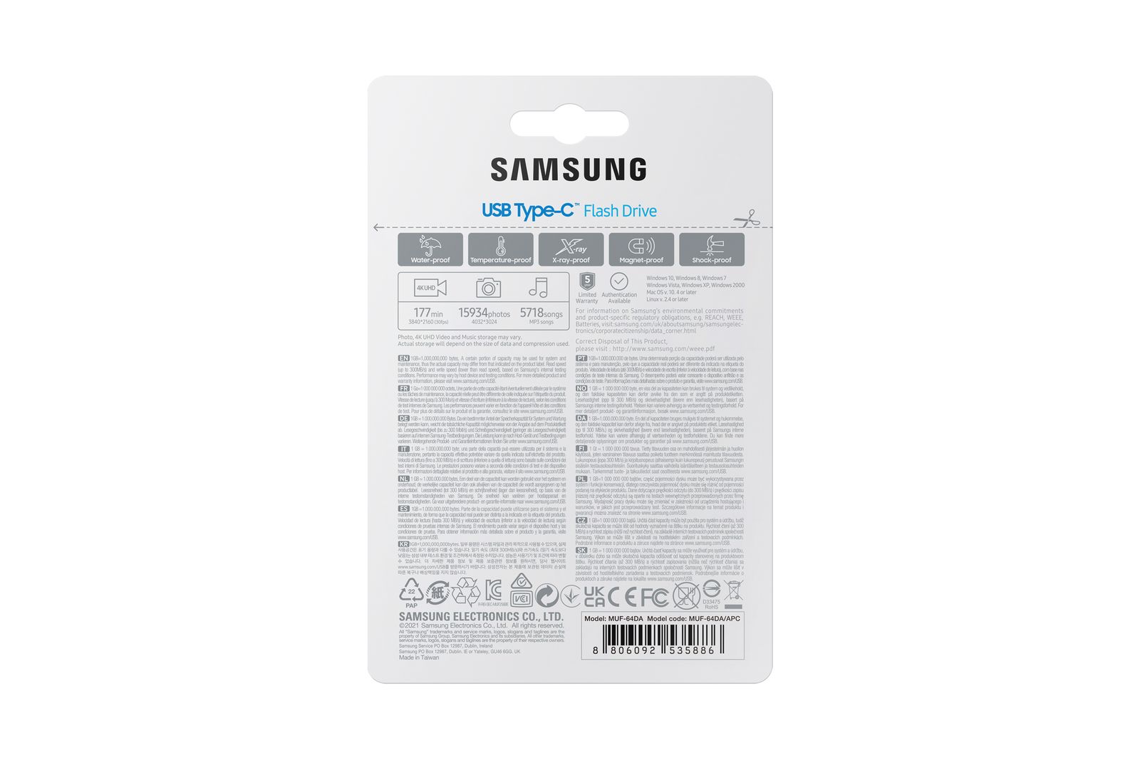 Samsung MUF-64DA. Capacità: 64 GB, Interfaccia dispositivo: USB tipo-C, Versione USB: 3.2 Gen 1 (3.1 Gen 1), Velocità di lettura: 400 MB/s. Fattore di forma: Cuffia. Peso: 3,4 g. Colore del prodotto: Blu