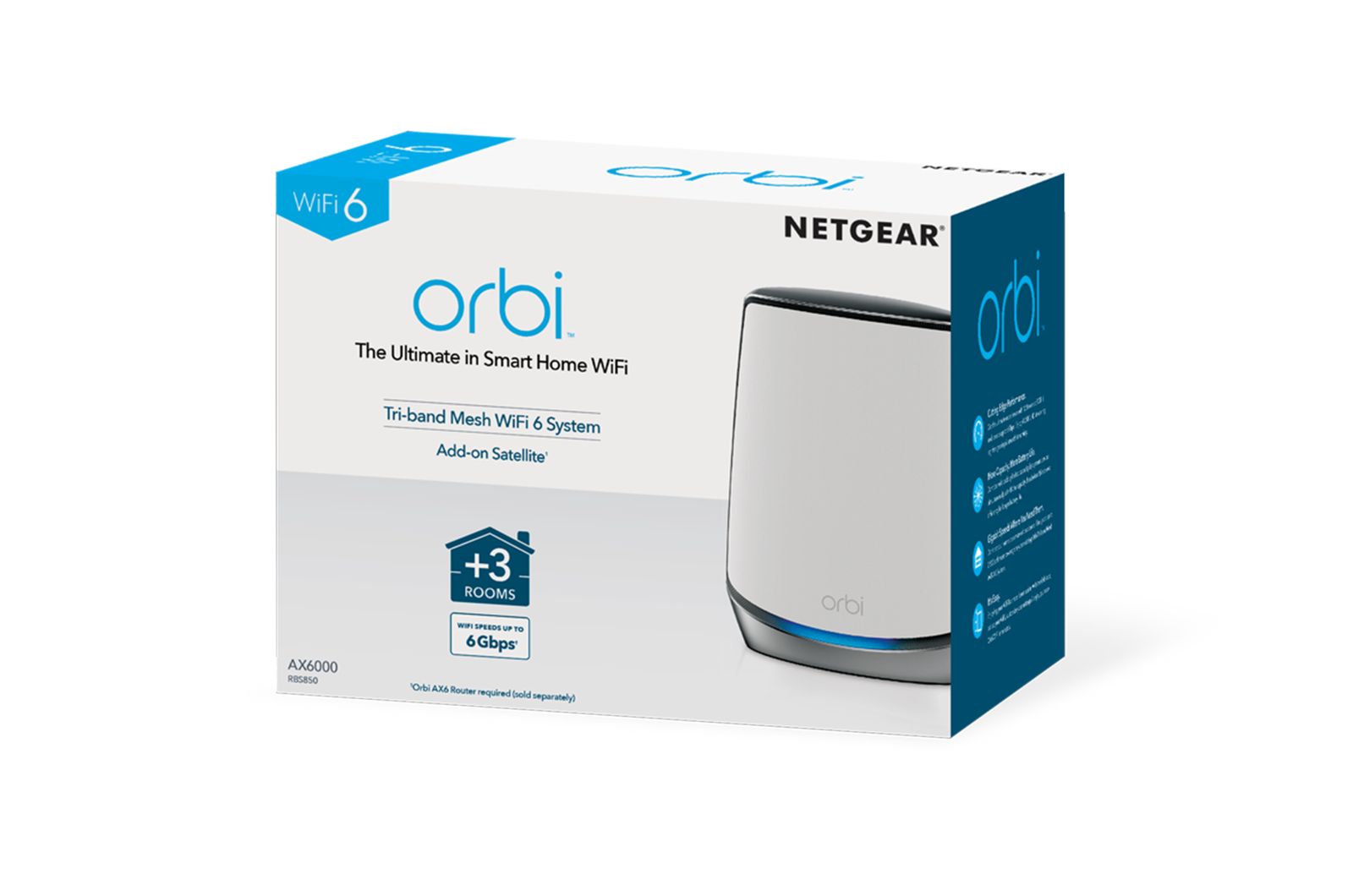 NETGEAR Orbi RBS850 AX6000 WiFi 6 Mesh Sattelite. Colore del prodotto: Grigio, Bianco, Tipo di antenna: Interno, Indicatori LED: Potenza. Banda Wi-Fi: Banda tripla (2.4 GHz/5 GHz/5 GHz), Wi-Fi standard: Wi-Fi 6 (802.11ax), Standard Wi-Fi: 802.11a, 802.11b, 802.11g, Wi-Fi 4 (802.11n), Wi-Fi 5 (802.11ac), Wi-Fi 6 (802.11ax). Frequenza del processore: 2,2 GHz, Assistente virtuale: Amazon Alexa & Google Assistant. Adattatore di voltaggio output AC: 12 V, Adattatore di corrente output AC: 3,5 A. Larghezza: 254 mm, Profondità: 190,5 mm, Altezza: 71,1 mm