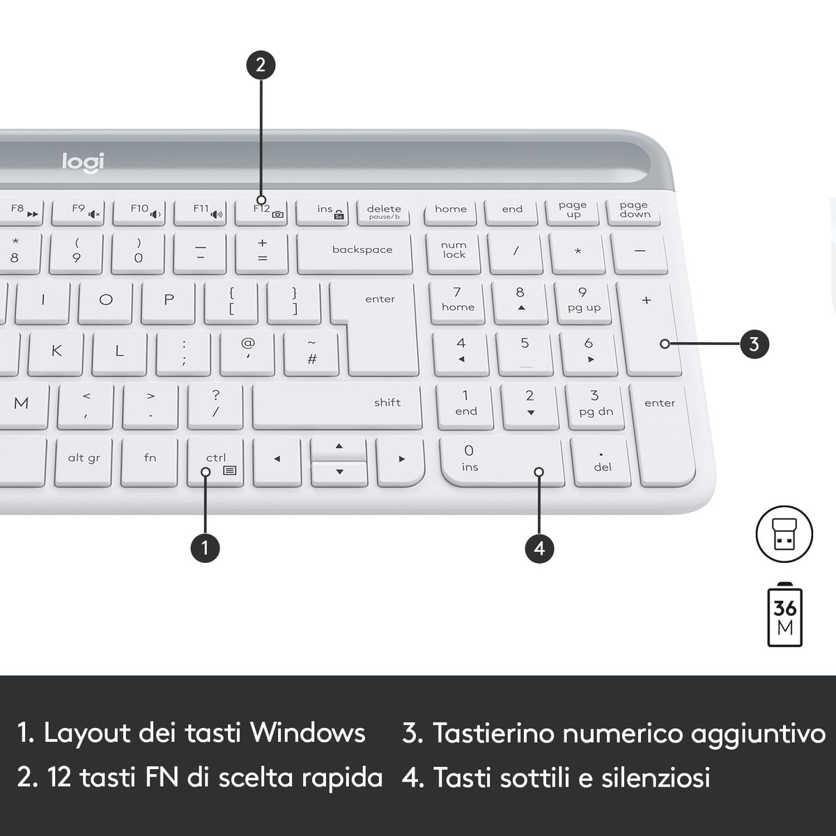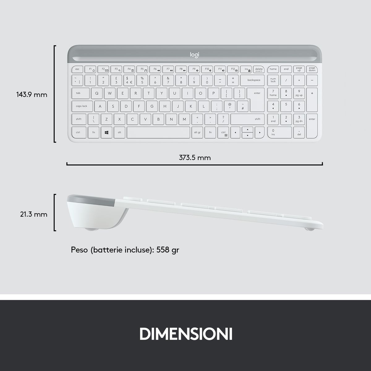 Logitech MK470 Kit Mouse e Tastiera, Layout Italiano Qwerty. Fattore di forma tastiera: Full-size (100%). Stile tastiera: Dritto. Interfaccia dispositivo: RF Wireless, Struttura tastiera: QWERTY, Utilizzo raccomandato: Ufficio. Colore del prodotto: Bianco. Mouse incluso