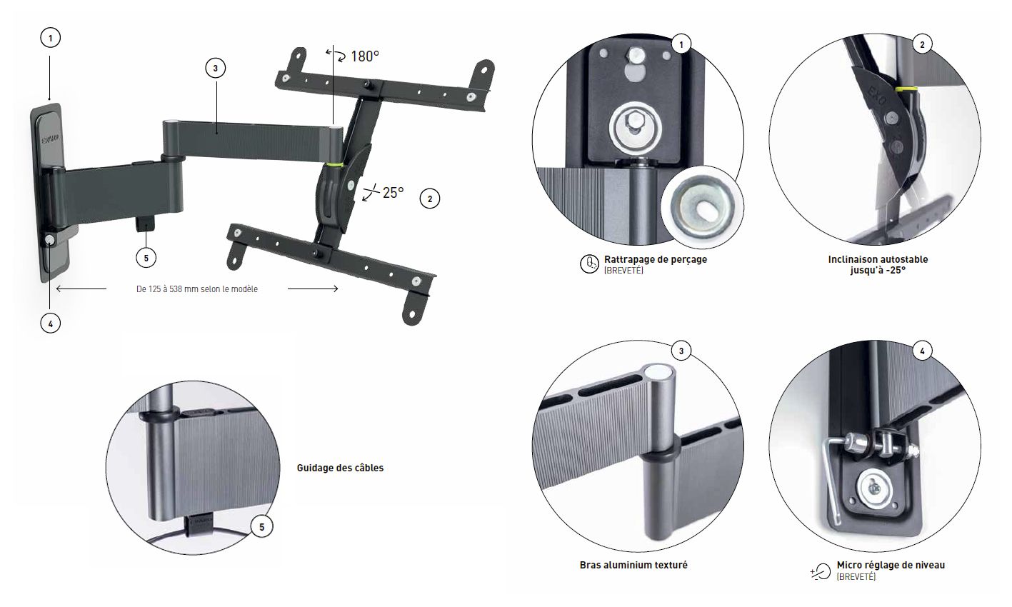ITB ER048140. Peso massimo (capacità): 25 kg, Capienza minima dimensioni dello schermo: 76,2 cm (30"), Capienza massima dimensioni dello schermo: 165,1 cm (65"), Compatibilità interfaccia di montaggio (min): 200 x 200 mm, Compatibilità interfaccia di montaggio (max): 400 x 400 mm. Angolo di rotazione: 55°, Distanza dalla parete (min): 12,5 cm, Distanza dal muro (massima): 4,9 cm. Colore del prodotto: Alluminio