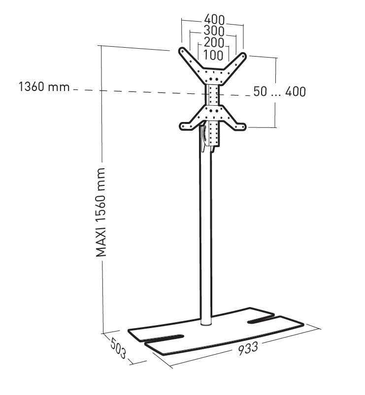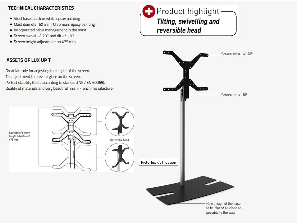 ITB ER038252. Montaggio: Libera installazione, Peso massimo (capacità): 30 kg, Capienza minima dimensioni dello schermo: 76,2 cm (30"), Capienza massima dimensioni dello schermo: 165,1 cm (65"), Compatibilità interfaccia di montaggio (min): 400 x 400 mm, Compatibilità interfaccia di montaggio (max): 400 x 400 mm. Regolazione altezza, Angolo di rotazione: 20 - -20°, Inclinazione: 10 - -10°. Colore del prodotto: Nero