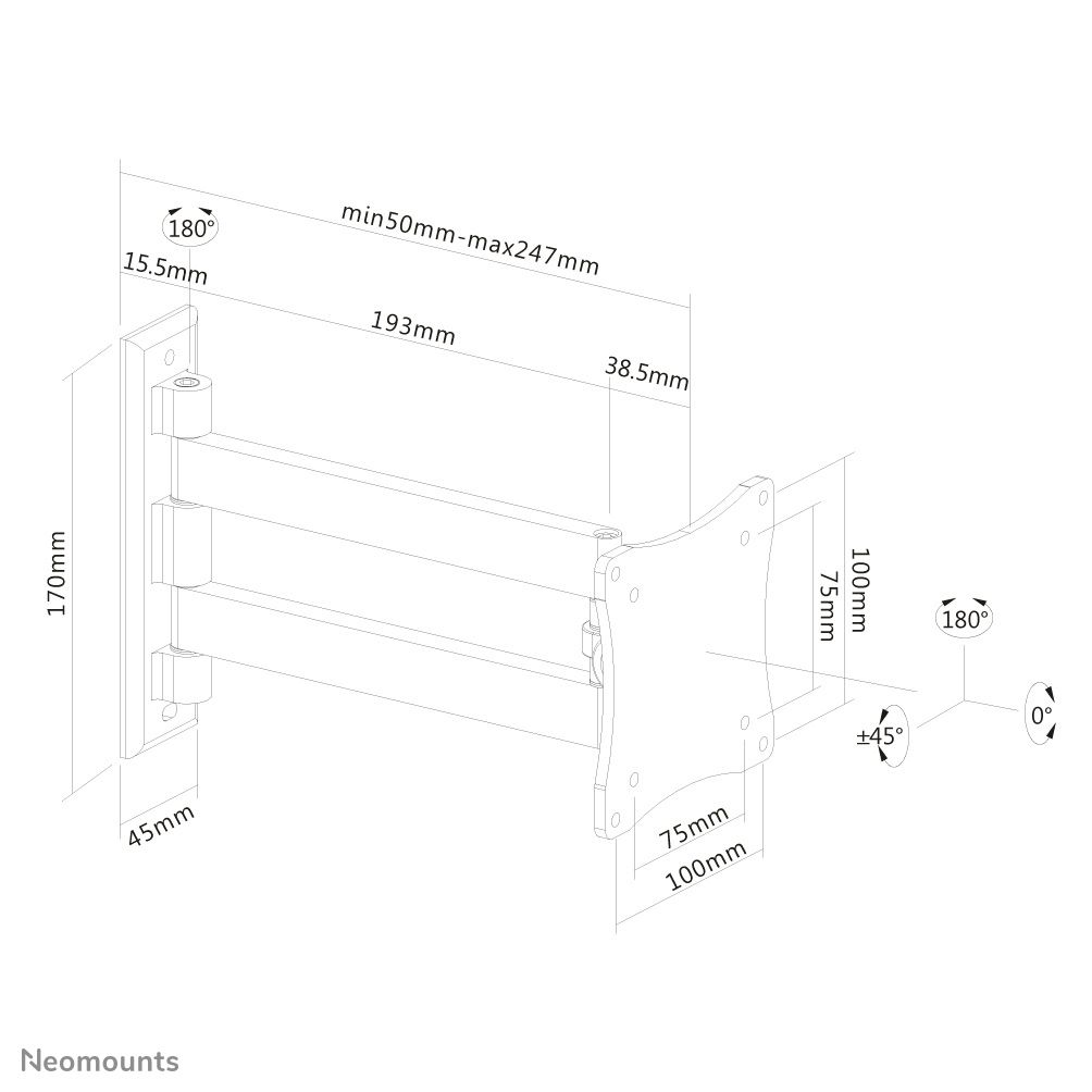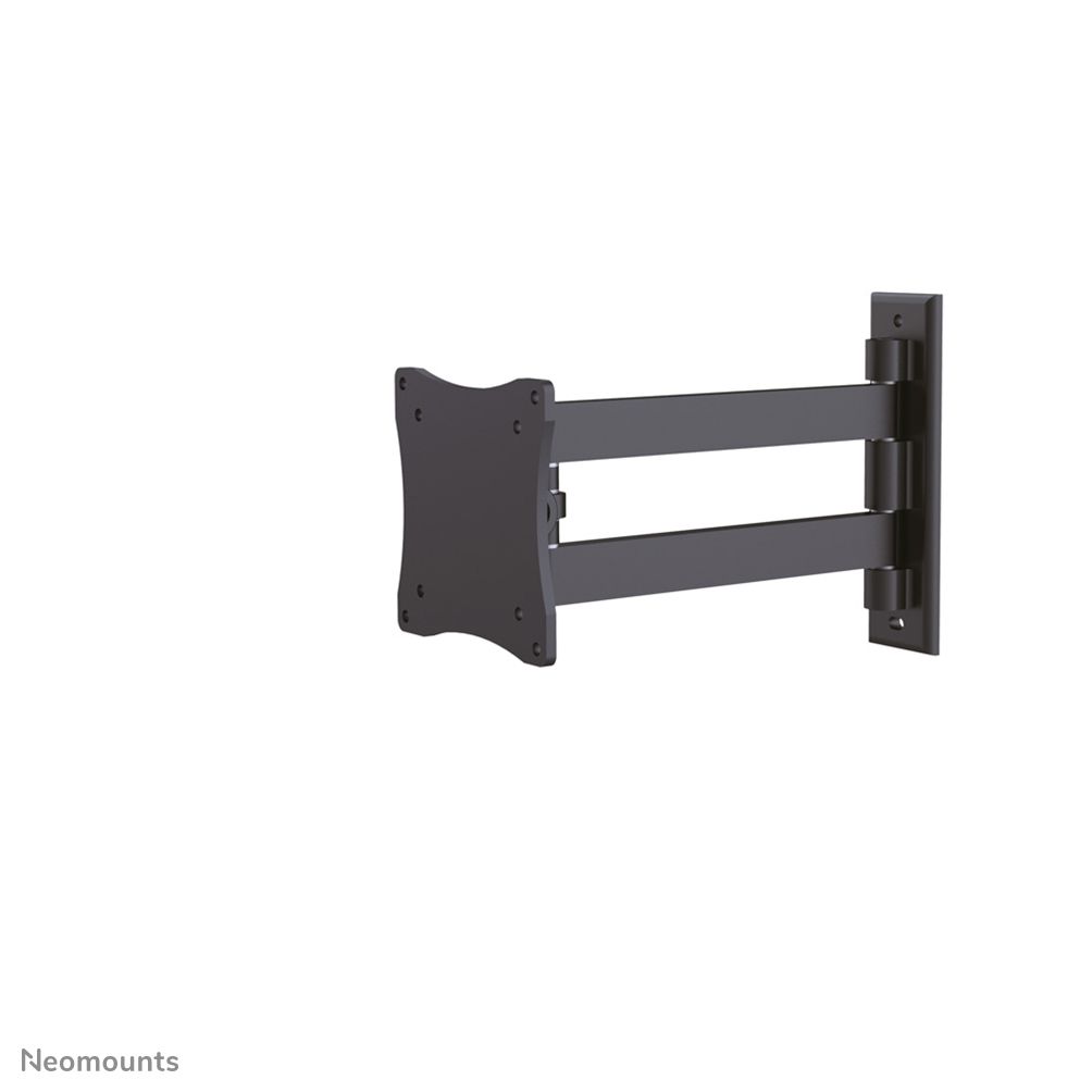 Neomounts Supporto a parete per monitor/TV. Peso massimo (capacità): 15 kg, Capienza minima dimensioni dello schermo: 25,4 cm (10"), Capienza massima dimensioni dello schermo: 68,6 cm (27"), Compatibilità interfaccia di montaggio (min): 75 x 75 mm, Compatibilità interfaccia di montaggio (max): 100 x 100 mm. Inclinazione: 0 - 90°, Distanza dalla parete (min): 5 cm, Distanza dal muro (massima): 25 cm. Colore del prodotto: Nero