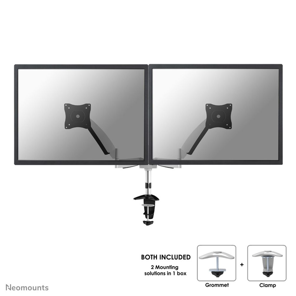 Neomounts Supporto da scrivania per monitor. Montaggio: Morsa/Bullone di ancoraggio, Peso massimo (capacità): 9 kg, Capienza minima dimensioni dello schermo: 25,4 cm (10"), Capienza massima dimensioni dello schermo: 68,6 cm (27"), Compatibilità interfaccia di montaggio (min): 75 x 75 mm, Compatibilità interfaccia di montaggio (max): 100 x 100 mm. Regolazione altezza, Inclinazione: 0 - 130°. Colore del prodotto: Argento