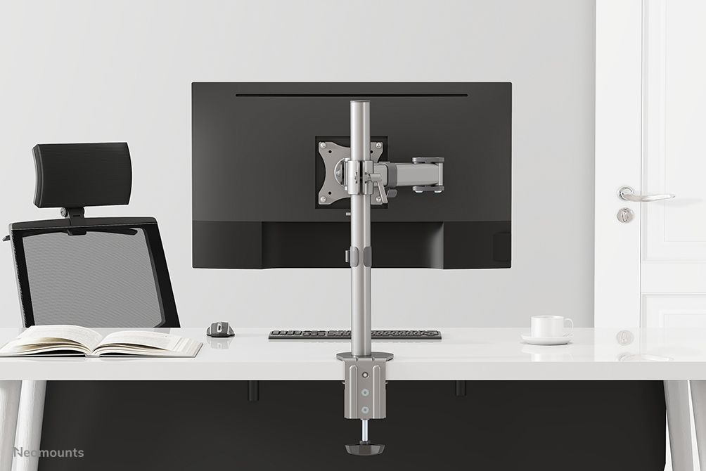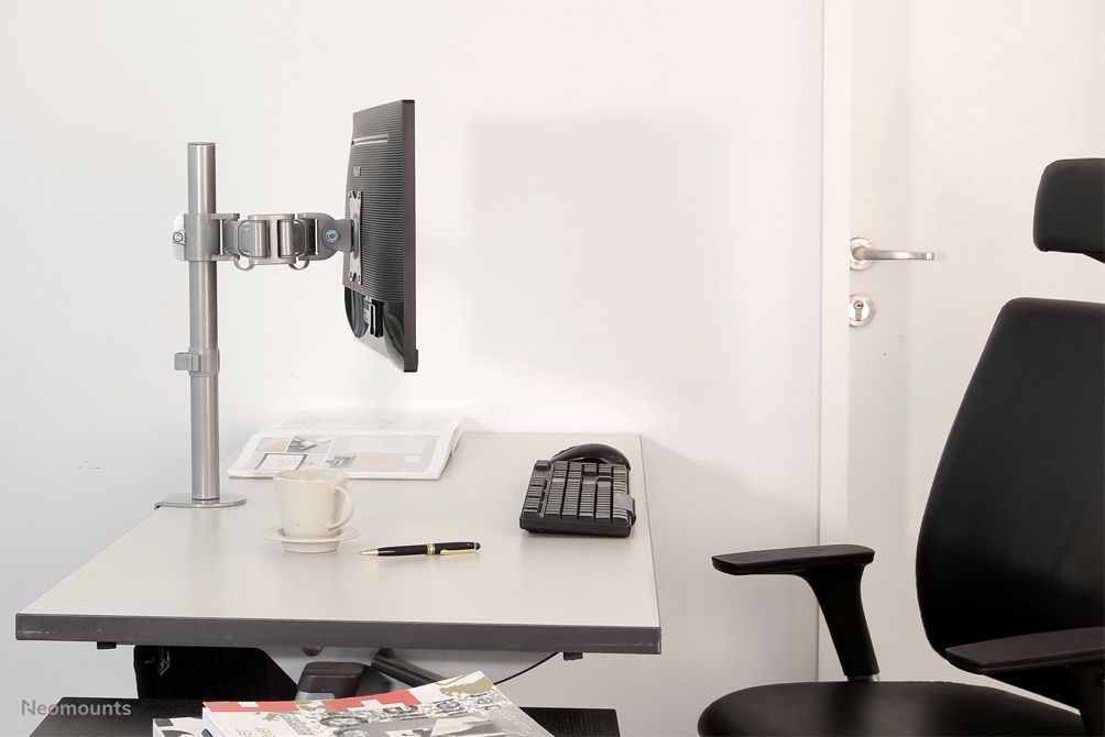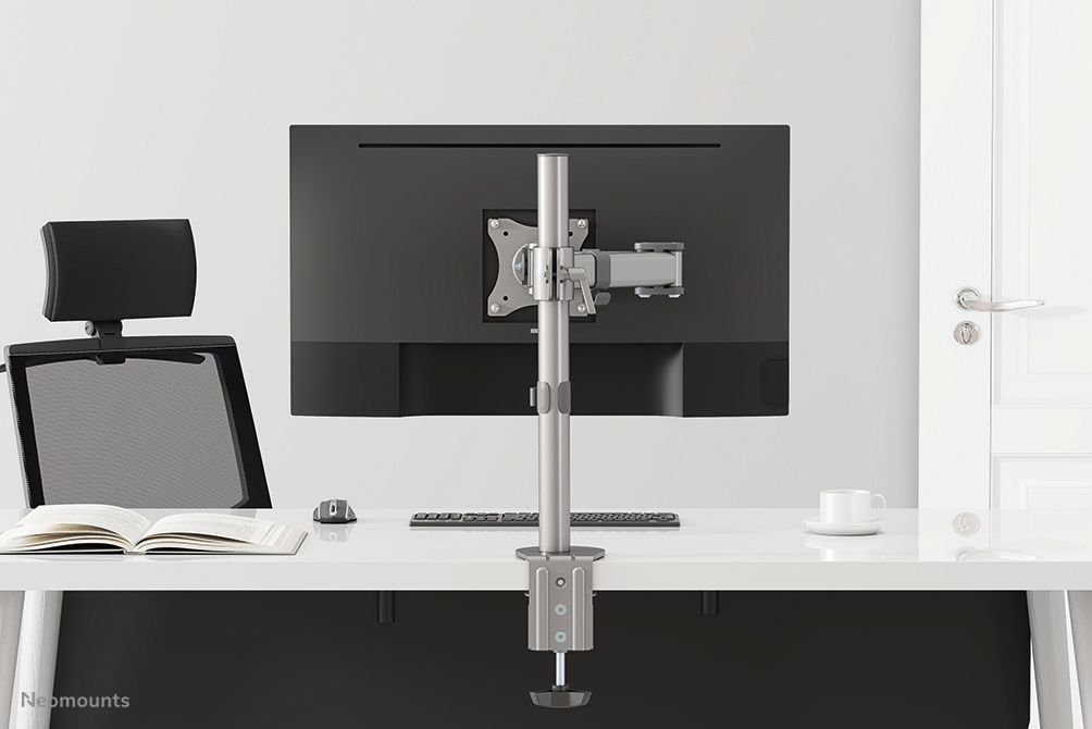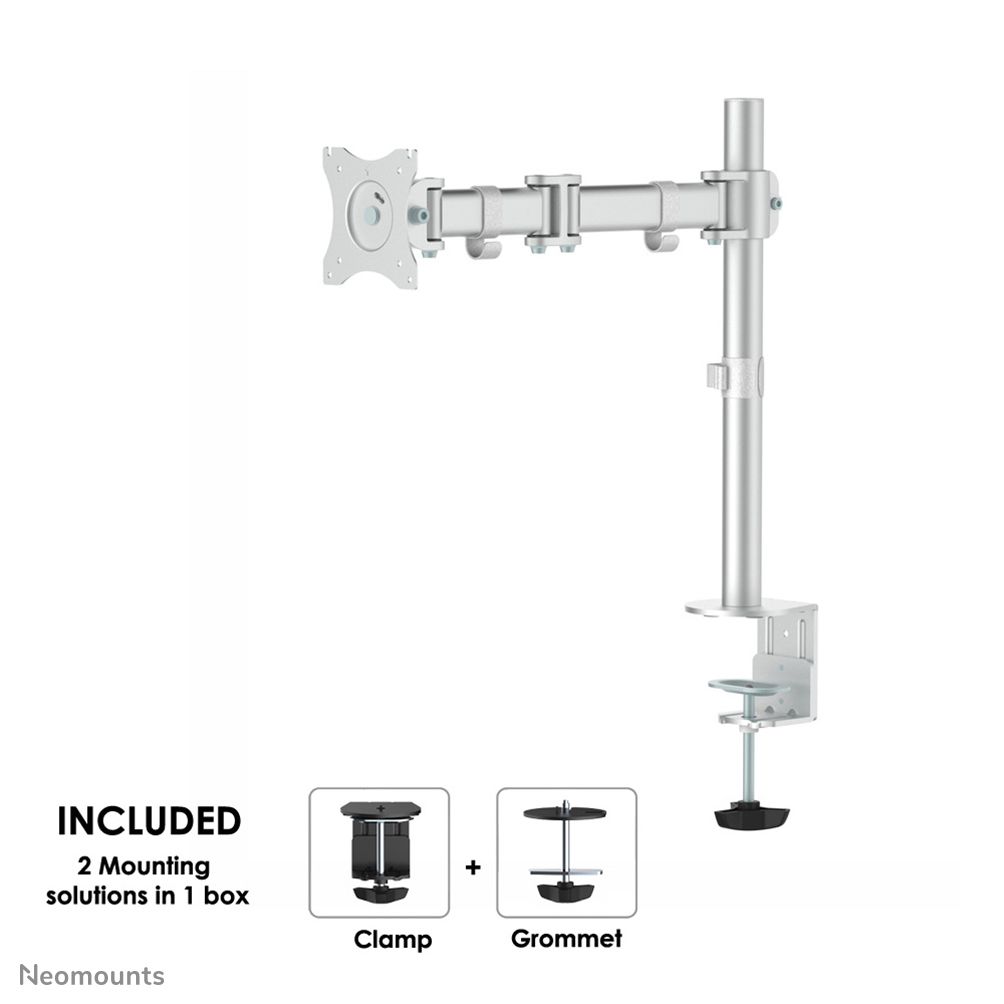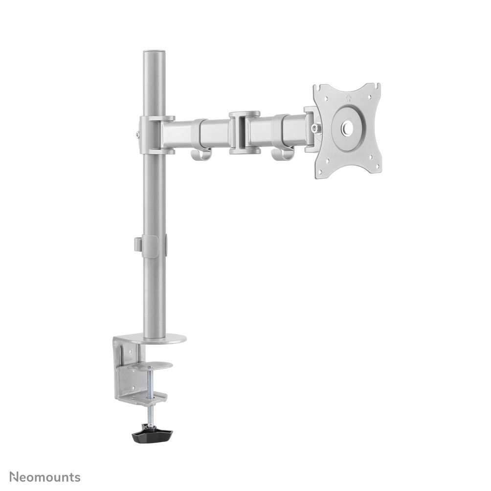 Neomounts Supporto da scrivania per monitor. Montaggio: Morsa/Bullone di ancoraggio, Peso massimo (capacità): 8 kg, Capienza minima dimensioni dello schermo: 25,4 cm (10"), Capienza massima dimensioni dello schermo: 76,2 cm (30"), Compatibilità interfaccia di montaggio (min): 75 x 75 mm, Compatibilità interfaccia di montaggio (max): 100 x 100 mm. Regolazione altezza, Inclinazione: 0 - 90°. Colore del prodotto: Argento