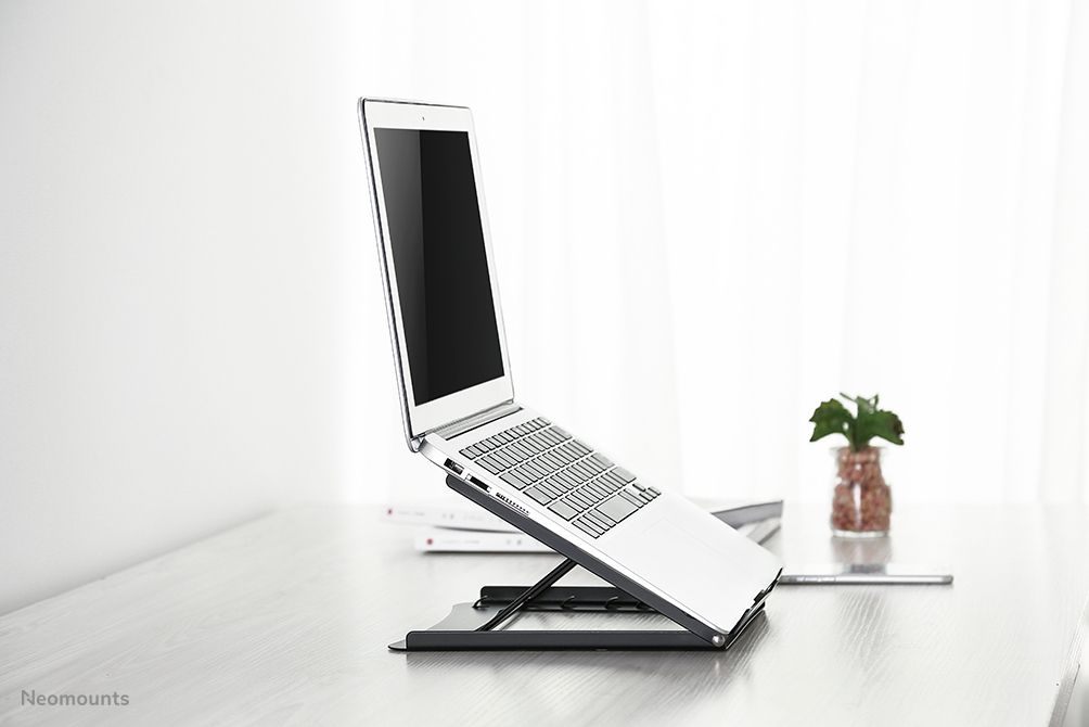 Neomounts Supporto per laptop. Tipo di prodotto: Supporto per computer portatile, Colore del prodotto: Nero, Dimensione minima compatibile dello schermo del notebook: 25,4 cm (10"). Larghezza: 255 mm, Profondità: 255 mm, Altezza: 35 mm. Larghezza imballo: 235 mm, Profondità imballo: 38 mm, Altezza imballo: 240 mm. Larghezza scatola principale: 255 mm, Lunghezza del cartone principale: 410 mm, Altezza scatola principale: 485 mm. Peso netto del pacco: 780 g
