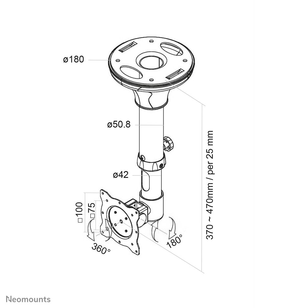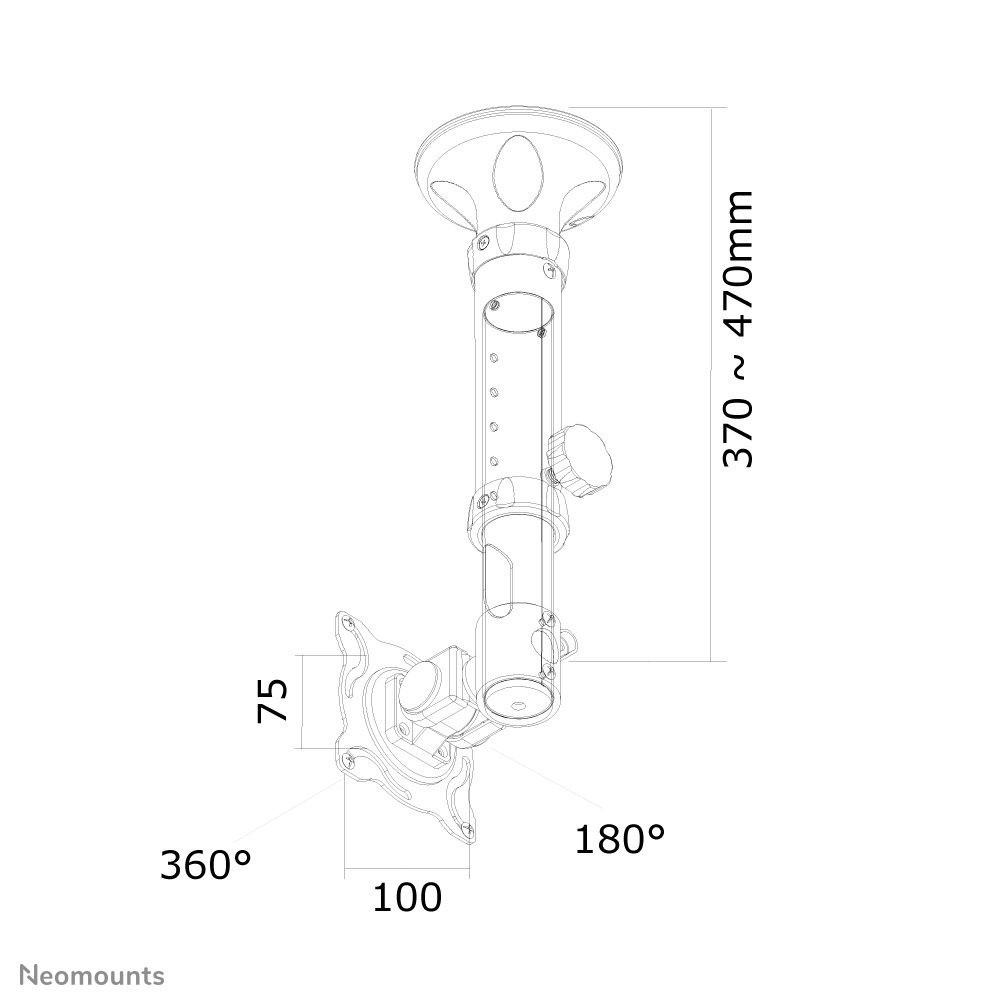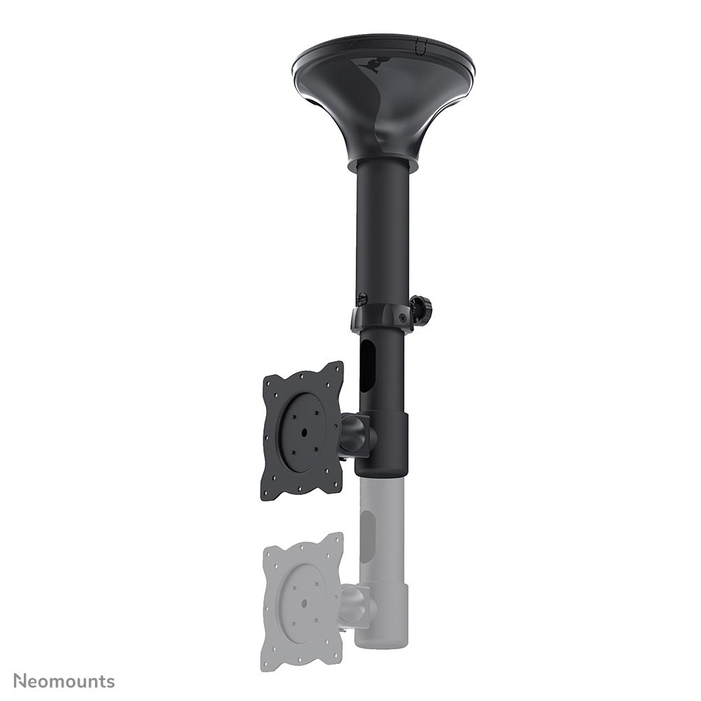Neomounts Supporto da soffitto per schermi LCD/LED/TFT. Peso massimo (capacità): 12 kg, Capienza minima dimensioni dello schermo: 25,4 cm (10"), Capienza massima dimensioni dello schermo: 76,2 cm (30"), Compatibilità interfaccia di montaggio (min): 75 x 75 mm, Compatibilità interfaccia di montaggio (max): 100 x 100 mm. Range di regolazione altezza: 370 - 470 mm, Inclinazione: 0 - 180°. Colore del prodotto: Nero