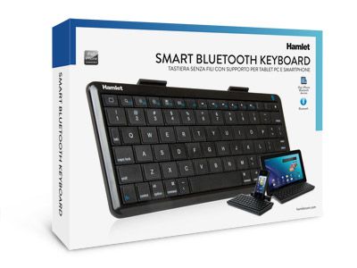 Hamlet Smart Bluetooth Keyboard tastiera senza fili con supporto per tablet pc e smartphone. Struttura tastiera: QWERTY. Colore del prodotto: Nero. Interfaccia dispositivo: Bluetooth, Range wireless: 10 m. Tecnologia batteria: Litio. Dimensioni tastiera (WxDxH): 217 x 925 x 19 mm