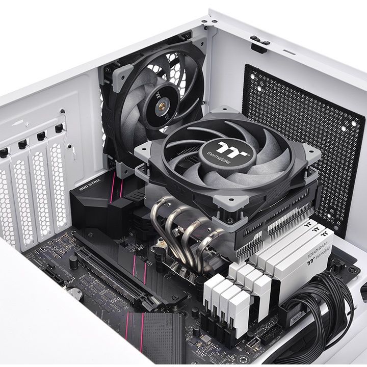 Thermaltake Toughair 110. Tipo: Refrigeratore, Diametro del ventilatore: 12 cm, Velocità (minima) di rotazione: 500 Giri/min, Velocità (massima) di rotazione: 2000 Giri/min, Rumorosità (velocità alta): 23,6 dB, flusso d'aria massimo: 58,35 pdc/min, pressione dell'aria massima: 2,41 mmH2O. Larghezza: 123,6 mm, Profondità: 137,7 mm, Altezza: 114,1 mm. Colore del prodotto: Nero, Argento