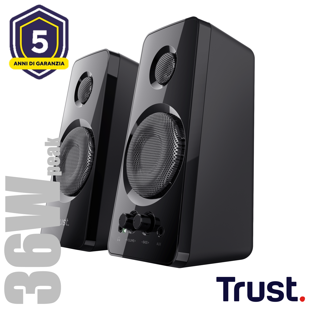 Trust Tytan. Utilizzo raccomandato: PC. Sistema audio: 2.0 canali. Tecnologia di connessione: Cablato. Potenza in uscita (RMS): 18 W, Range di frequenza: 20 - 20000 Hz, Impedenza: 4 Ω. Colore del prodotto: Nero
