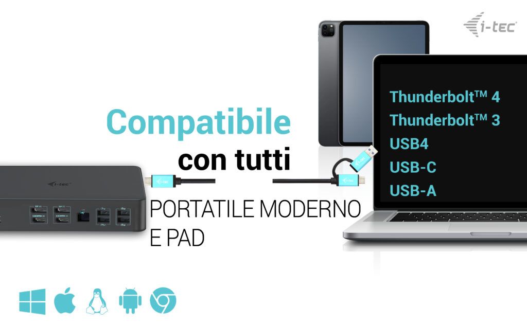 i-tec USB 3.0 / USB-C / Thunderbolt 3 Professional Dual 4K Display Docking Station Generation 2 + Power Delivery 100W. Tecnologia di connessione: Cablato, Interfaccia host: USB 3.2 Gen 1 (3.1 Gen 1) Type-C, Fornitura di alimentazione USB fino a: 100 W. Velocità trasferimento Ethernet LAN: 10,100,1000 Mbit/s. Colore del prodotto: Nero, Velocità di trasferimento dati: 10 Gbit/s, Tipologia HD: 4K Ultra HD. Tipologia alimentazione: AC, Alimentazione: 150 W, Voltaggio di uscita: 20 V. Altri sistemi operativi supportati: Android, ChromeOS