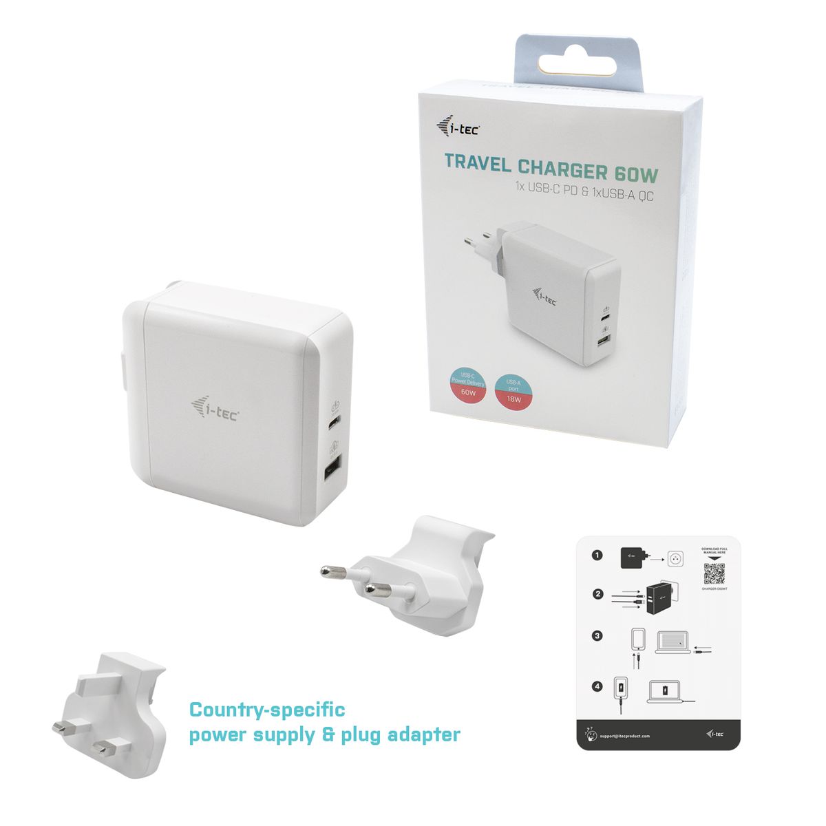 i-tec USB-C Travel Charger 60W + USB-A Port 18W. Tipo di caricatore: Interno, Tipologia alimentazione: AC, Compatibilità caricatore: Universale. Voltaggio di ingresso: 100 - 240 V, Tensione di uscita (max): 20 V, Adattatore di corrente output AC: 3 A. Quantità porte USB 2.0: 1, Quantità di porte USB Tipo C: 1, Ricarica rapida, Funzionalità di protezione dell'alimentazione: Sovraccarico, Surriscaldamento, Sovraccarico, Cortocircuito. Colore del prodotto: Bianco