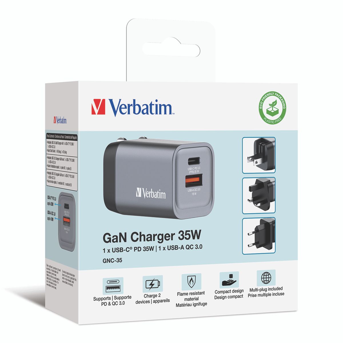 Verbatim GNC-35. Tipo di caricatore: Interno, Tipologia alimentazione: AC, Compatibilità caricatore: Universale. Voltaggio di ingresso: 100 - 240 V, Tensione di uscita (max): 20 V. Quantità di porte USB Tipo C: 1, Ricarica rapida, Funzionalità di protezione dell'alimentazione: Sovracorrente, Sovraccarico, Surriscaldamento, Cortocircuito. Colore del prodotto: Nero, Grigio