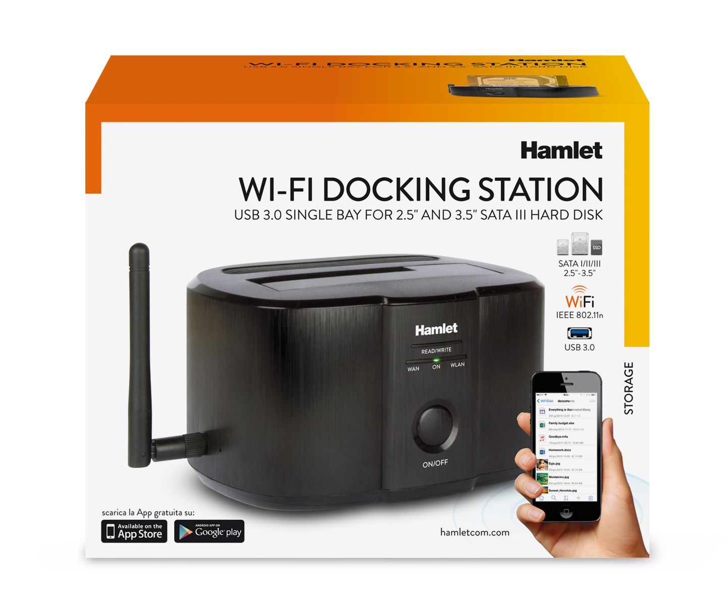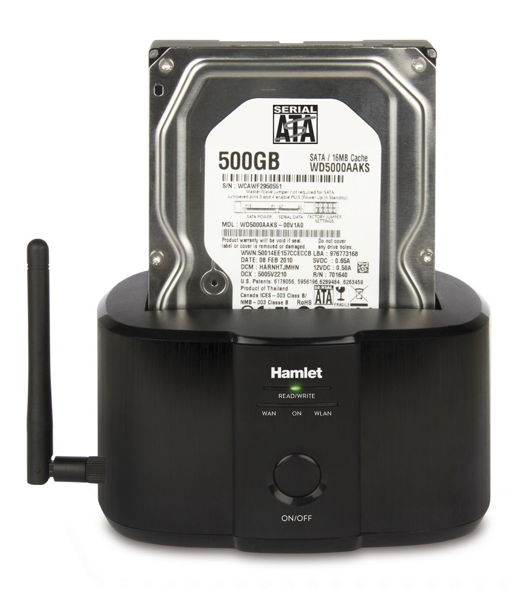 Hamlet Wi-Fi Docking Station per hard disk sata da 2,5'' o 3,5''. Capacità massima di memoria: 4 TB. Colore del prodotto: Nero, Materiali: Alluminio, Plastica, Indicatori LED: Attività. Larghezza: 142 mm, Profondità: 103 mm, Altezza: 83 mm. Sistema operativo Windows supportato: Windows 10 Education, Windows 10 Education x64, Windows 10 Enterprise, Windows 10 Enterprise x64,..., Compatibilità sistema operativo Mac: Mac OS X 10.4 Tiger, Mac OS X 10.5 Leopard, Mac OS X 10.6 Snow Leopard, Mac OS X 10.7 Lion, Mac OS.... Cavi inclusi: USB